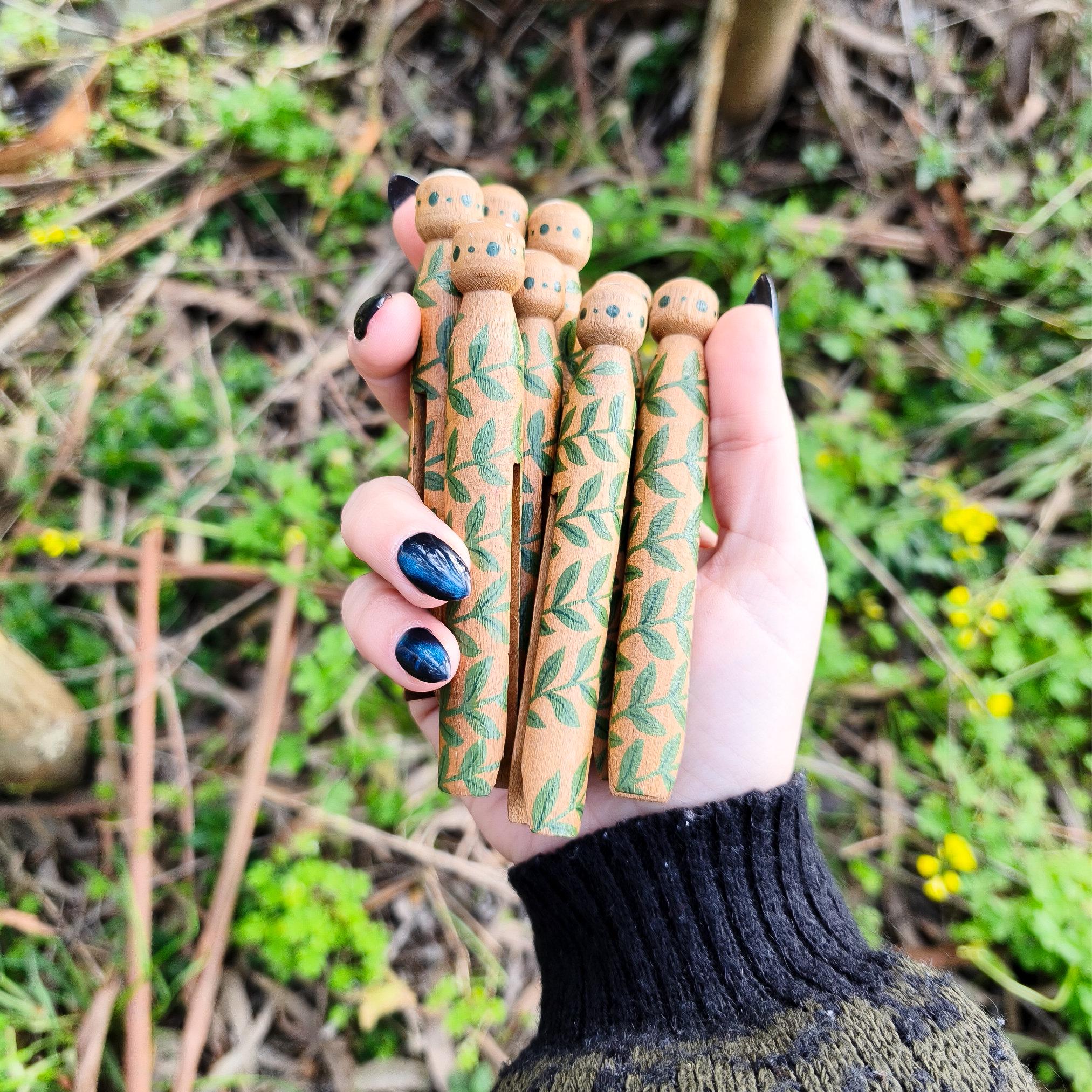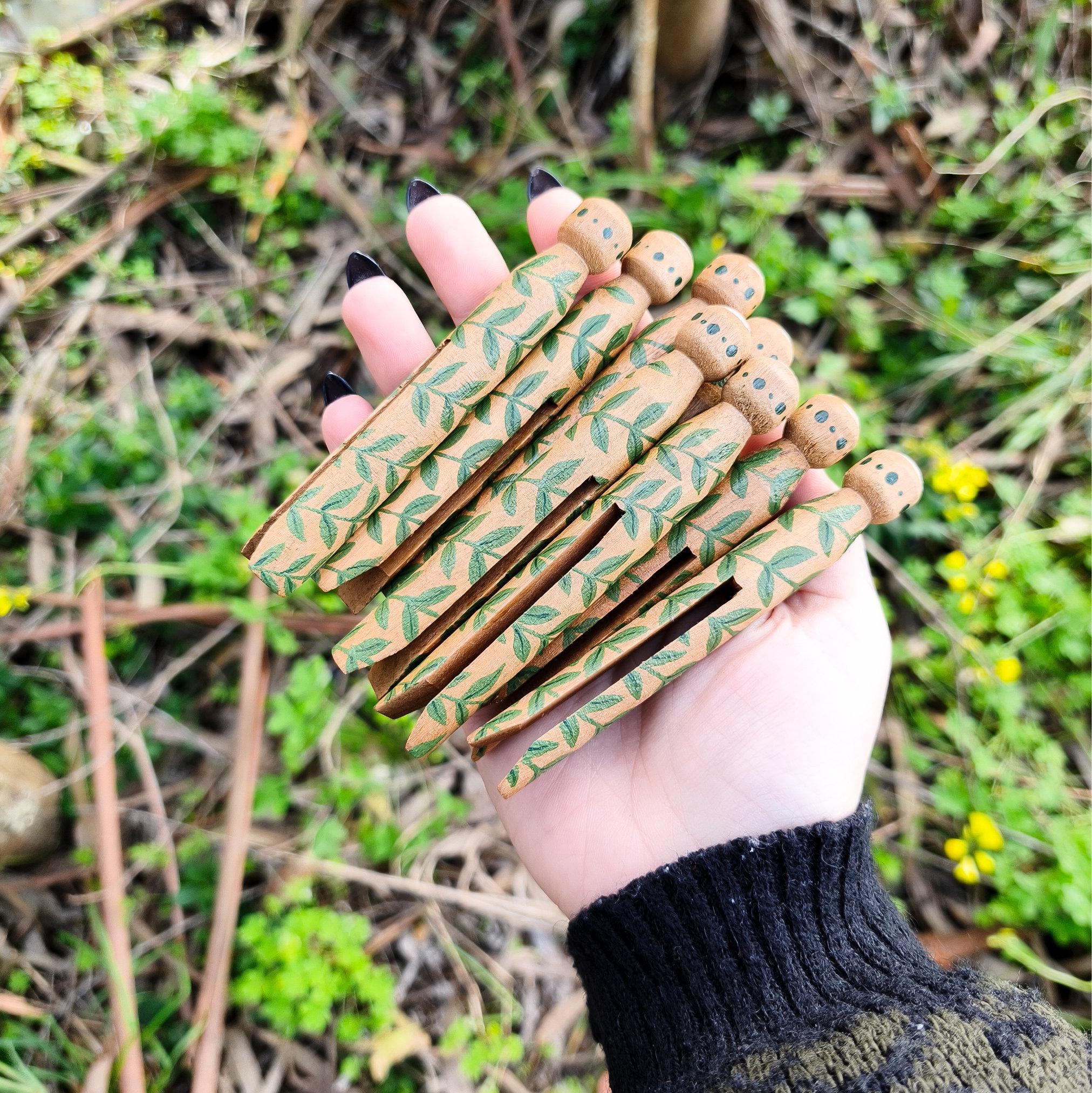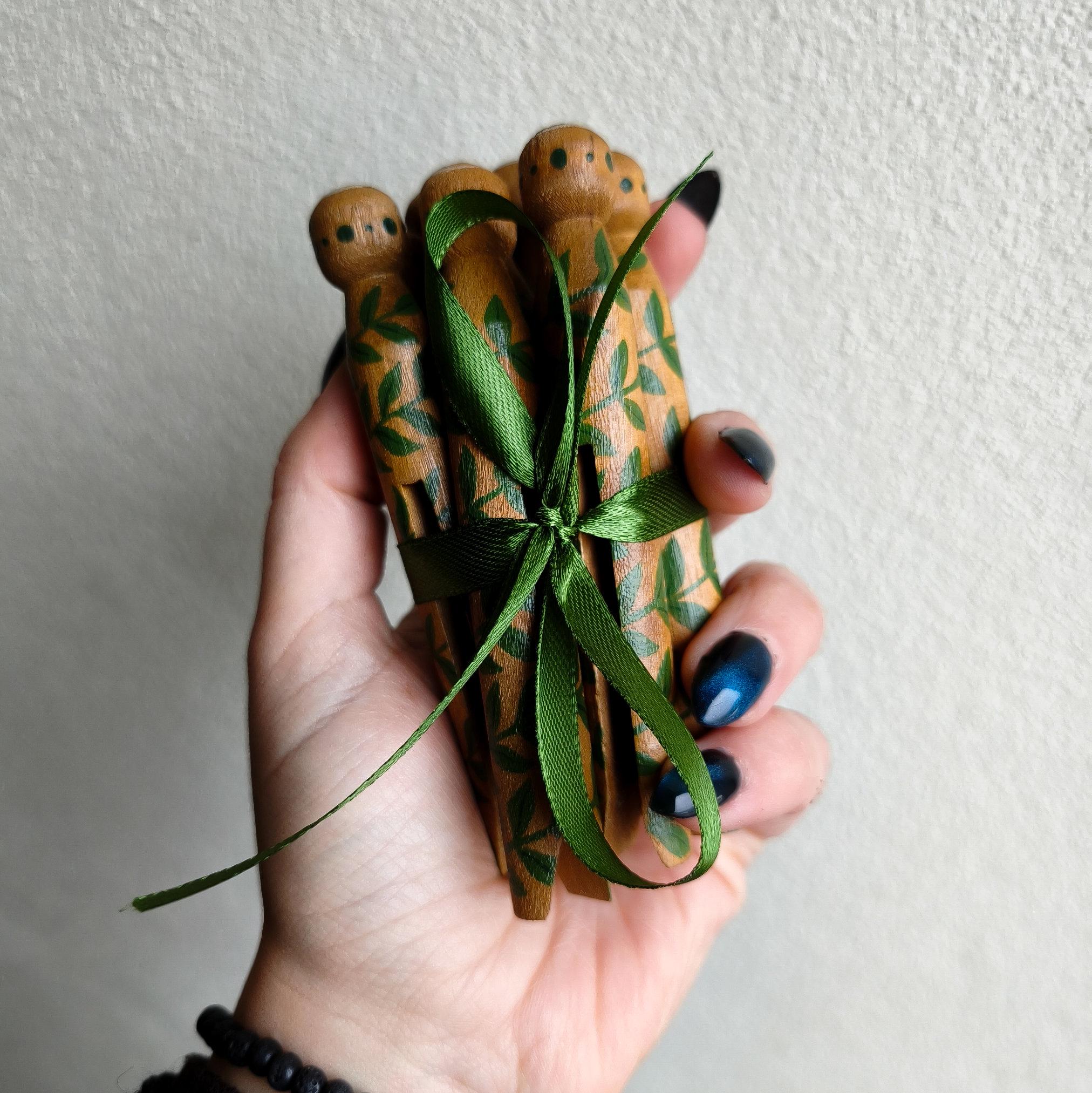 A small bundle of hand-painted wooden pegs, adorned with a botanical green leaf pattern and a moon detail on the top. Can be used to hold cloth, notes, paper offerings or as symbolic altar objects. A thoughtful gift for witches, forest souls, fairycore lovers or anyone drawn to handmade items.