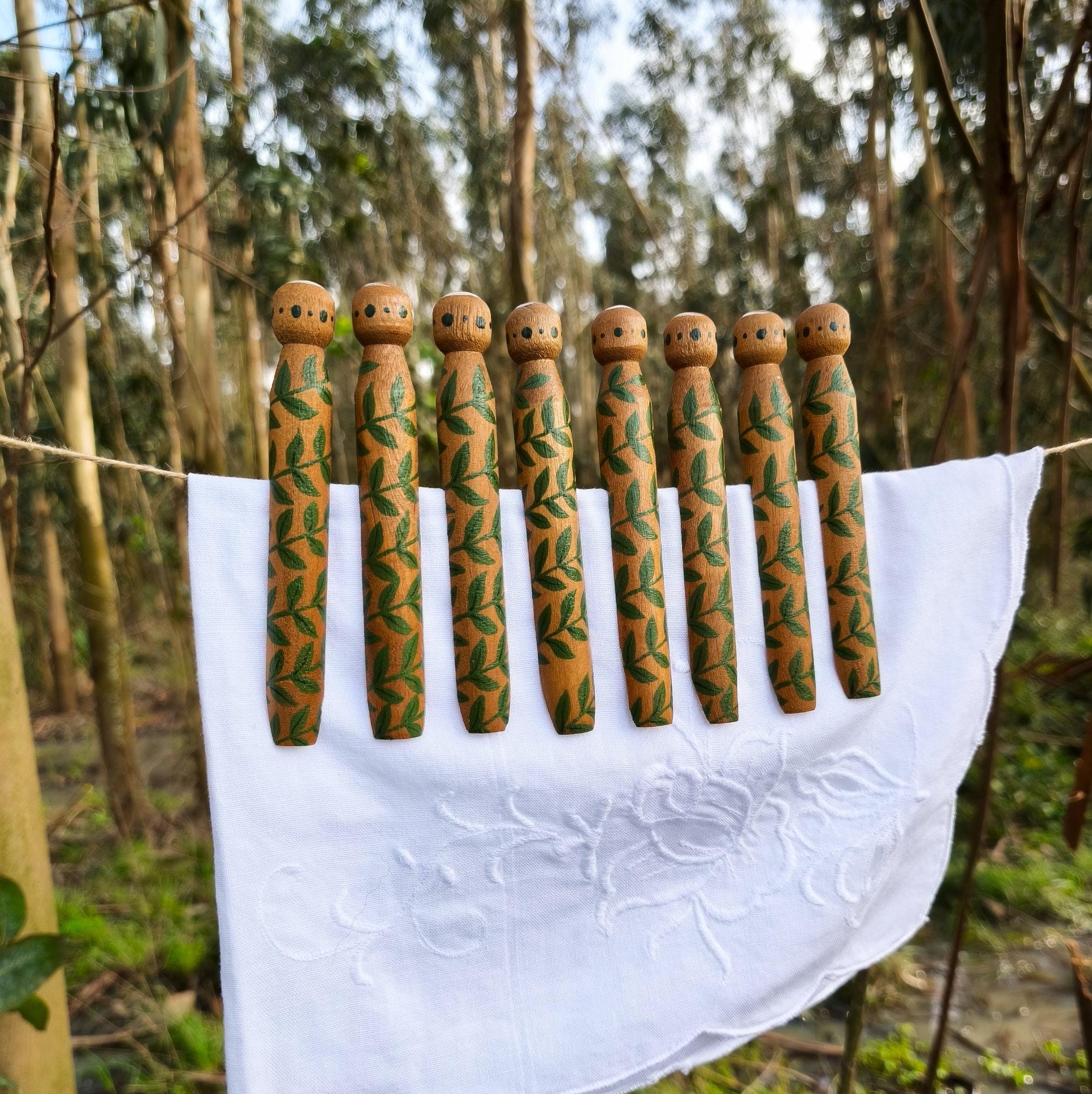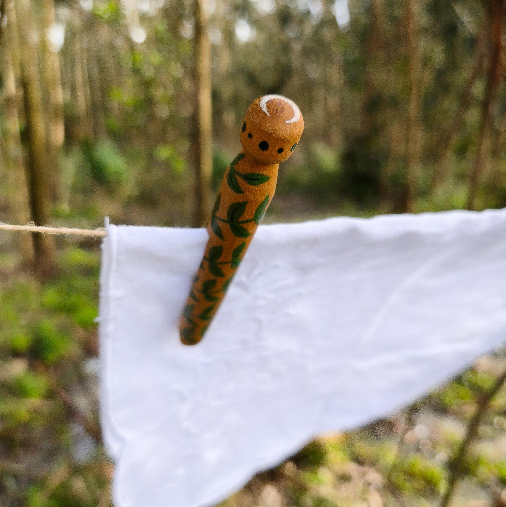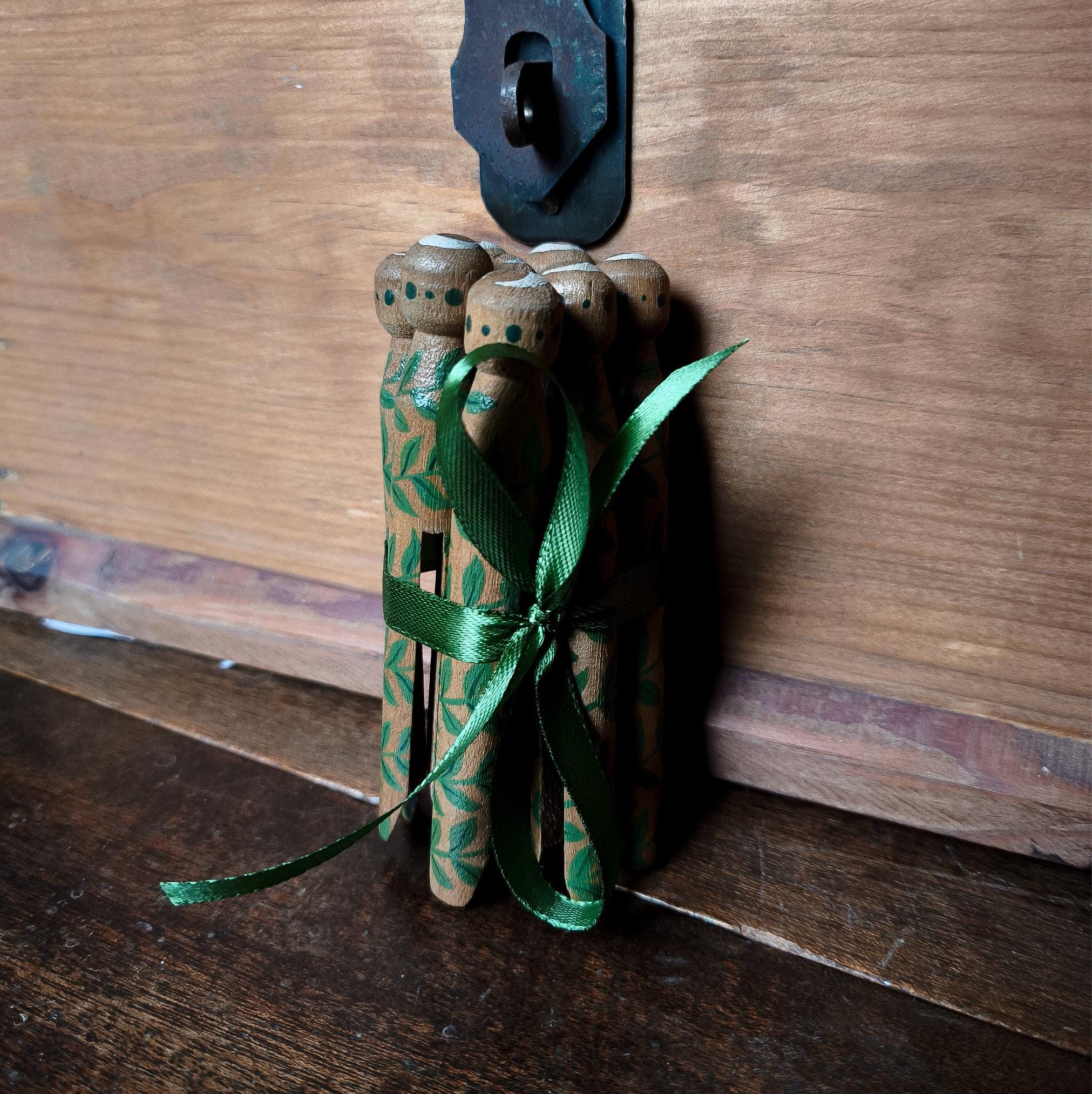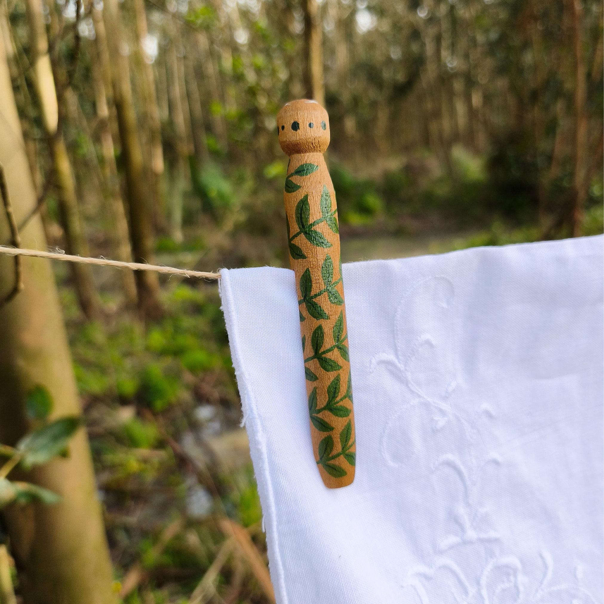 A small bundle of hand-painted wooden pegs, adorned with a botanical green leaf pattern and a moon detail on the top. Can be used to hold cloth, notes, paper offerings or as symbolic altar objects. A thoughtful gift for witches, forest souls, fairycore lovers or anyone drawn to handmade items.
