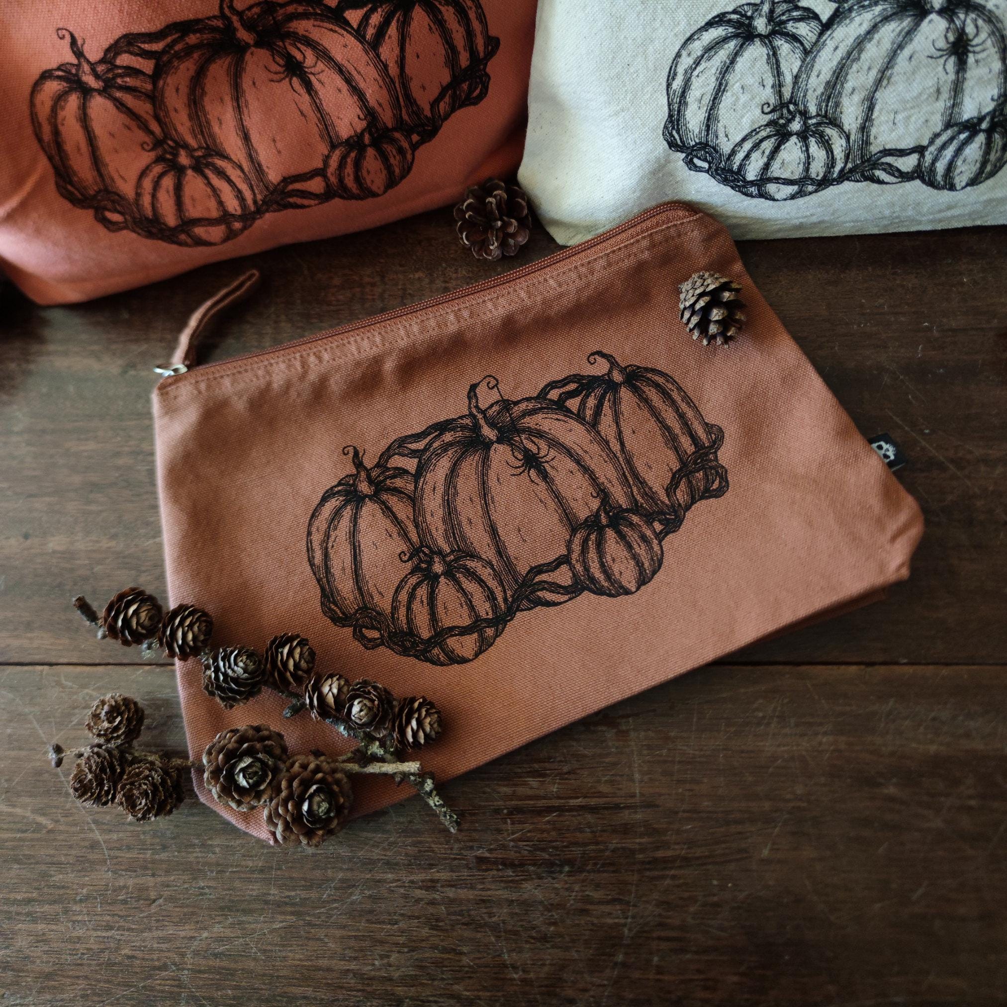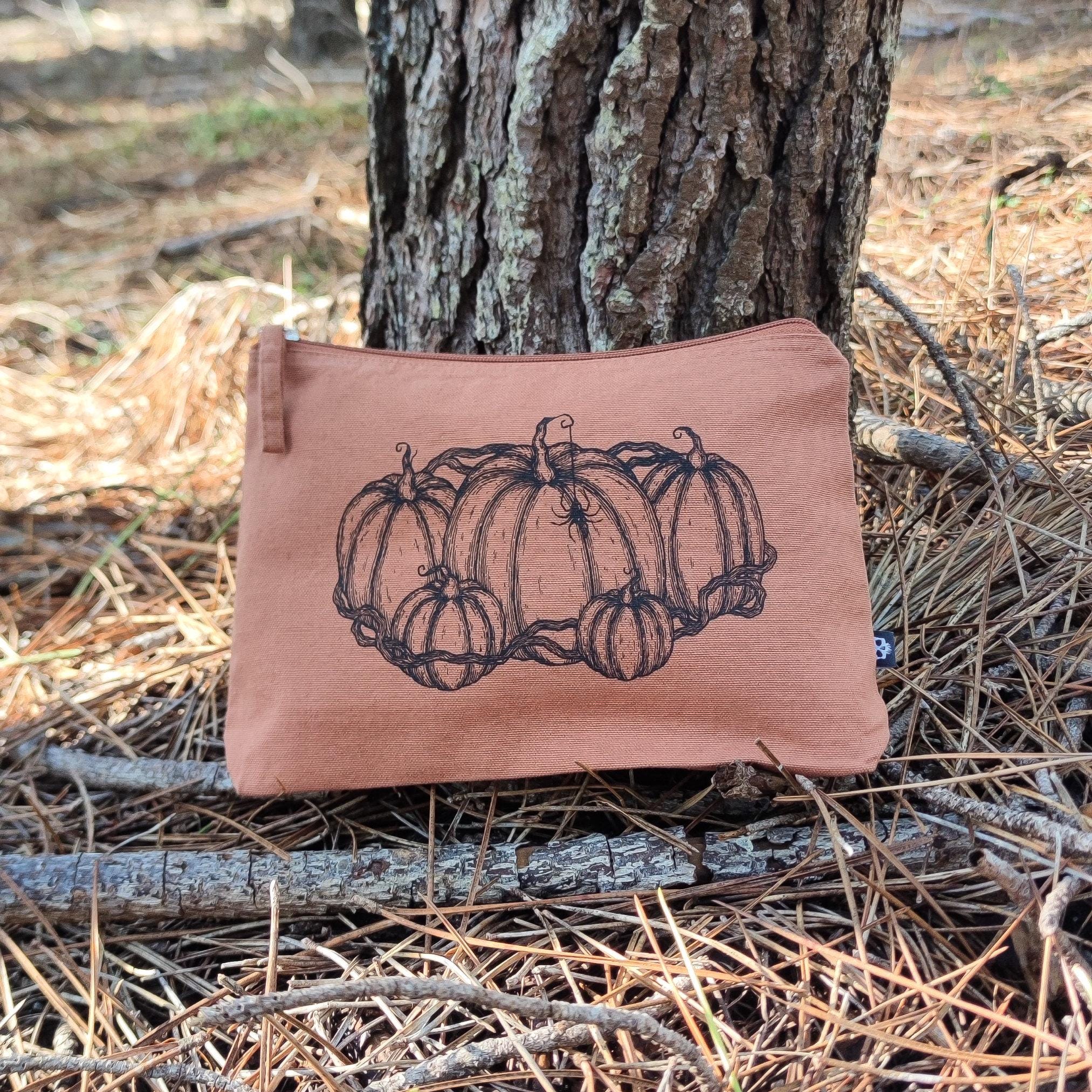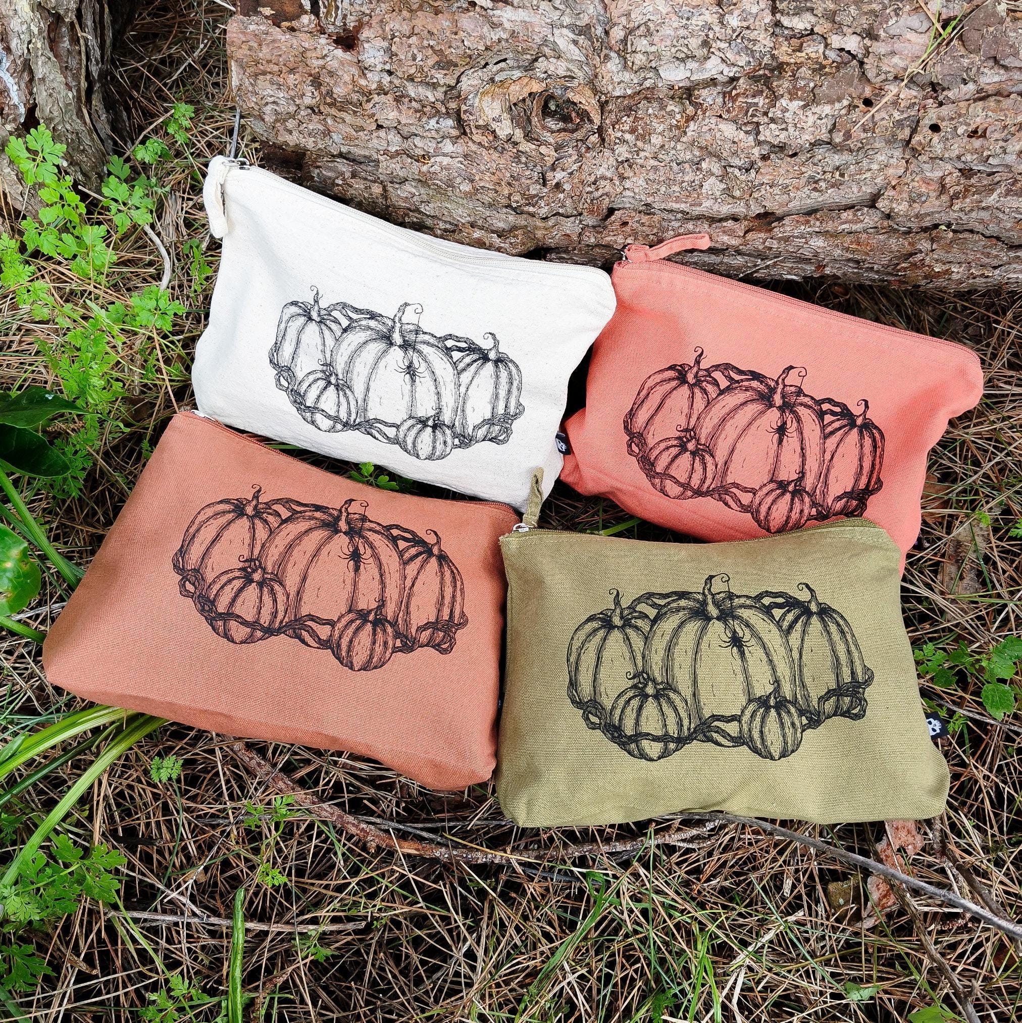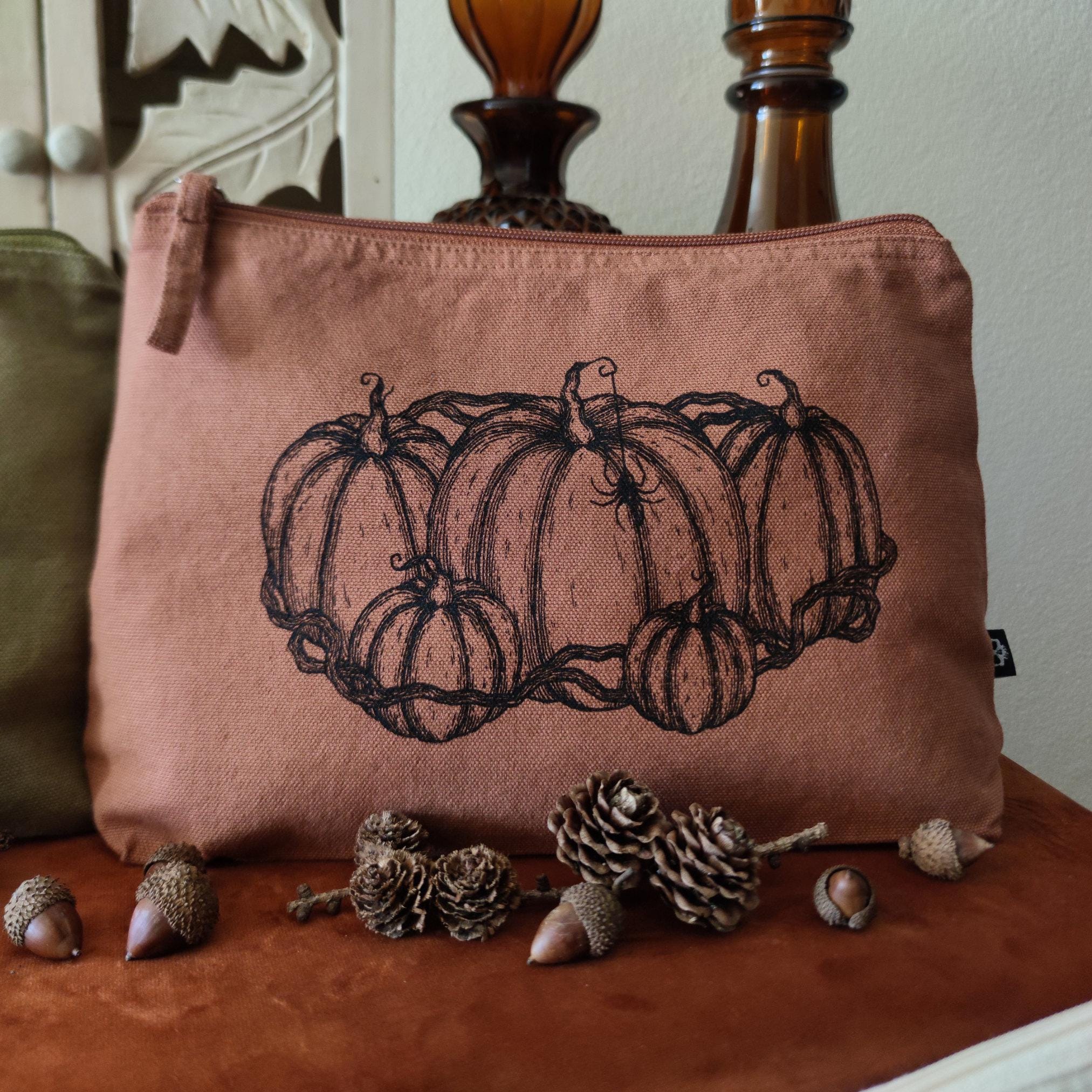 A spooky zipper pouch ideal as a makeup bag, pencil case or everyday essentials pouch. Illustrated with pumpkins that bring cozy witchy vibes and a touch of fall magic wherever you go. A perfect gift for autumn lovers, witches and dark academia souls.